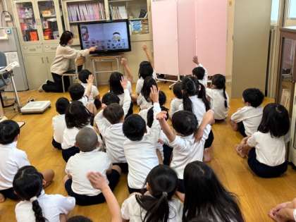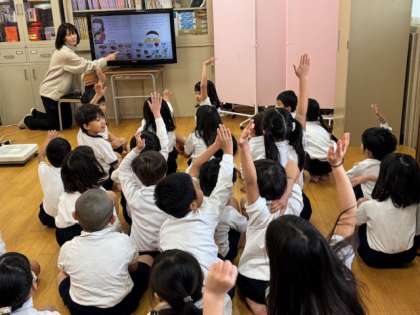 1年生は保健室で発育測定です。身長、体重を計測します。どれだけ大きくなったかなぁ??測る前に保健室の先生から体を元気にするための絵本を見せてもらいました。しっかり食べて、しっかり動いて、よく寝よう。