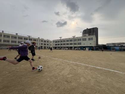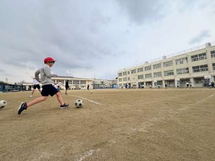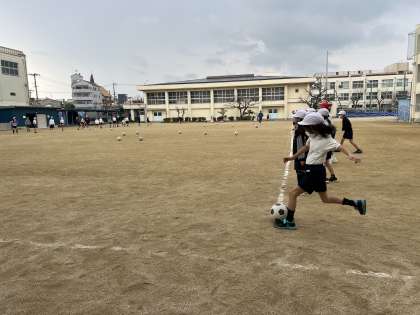 4年生は体育科でサッカーのゲームをするために、今日はボールを思いっきり蹴る練習をしていました。普段なかなか力いっぱいボールを蹴ることがないので、助走はどのくらいとればいいかな、足はどこに置けばいいかなと、子どもたちはとても楽しそうに活動していました。