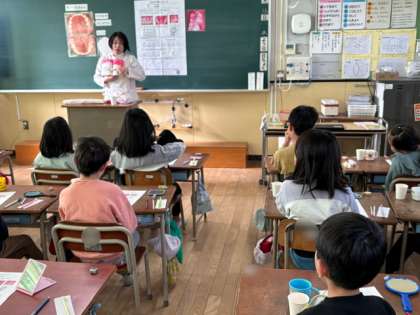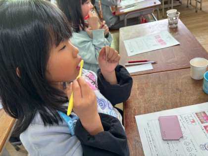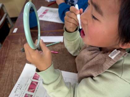 今日は歯科衛生士さんに来ていただいて、はみがきの仕方について教えていただきました。毎日のはみがきで正しく磨けているか、磨き残しがないかチェックしています。子どもたちも鏡を見ながら歯ブラシを上手に使って磨いています。お家でも、どんな風に磨いているのか見てあげてください。