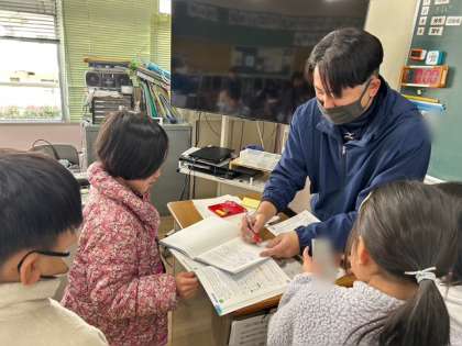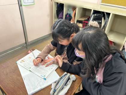 3年生の算数では分数と小数の大きさを比べる学習をしました。1を10等分し数直線を使って比べることができました。練習問題では、友だちに寄り添い丁寧に教える姿も見られました。