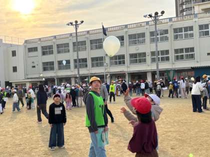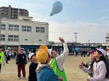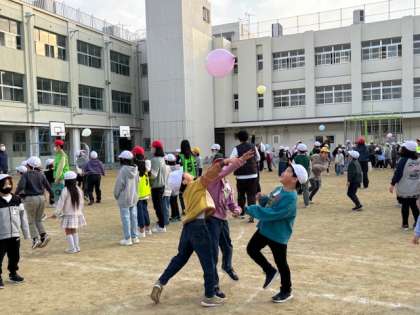 今日は運動場で風船バレーをしました。班ごとに風船をもらい、みんなでラリーを続けます。途中、風に流されて風船が飛んでいってしまうハプニングもありましたが、みんな楽しそうに追いかけています。強く打つと割れてしまうので優しくタッチしています。
