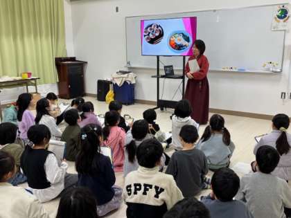 3年生はソンセンニムに韓国・朝鮮の文化について教えてもらいました。子どもたちもよく知っていて、前に写真が出ると「知ってる。ナムル、キンパやろ」と食べ物の名前が次々と出てきていました。食事のマナーや年中行事などについても教えていただきました。