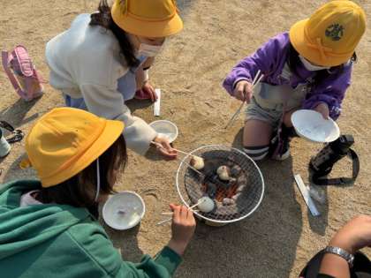 3年生は社会科で昔の道具について学習しました。今日は実際に七輪を使って炭で火をおこし、お餅を焼く体験をしています。火加減が難しく、強いと焦げるし、弱いと中まで焼けないようです。少し焦げた部分もありましたが、お醤油をぬって美味しくいただきました。「おかわりないの??」と美味しそうに食べていました。