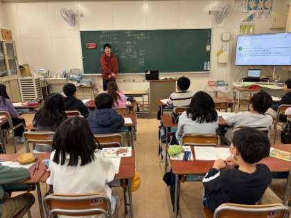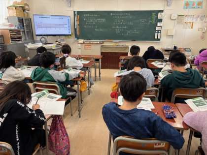 4年生は小数のかけ算の学習をしています。小数を一度整数に直してから計算しています。筆算の計算では小数点の位置に注意しながら計算しています。何度も繰り返し練習して、正確に計算できるように頑張りましょう。
