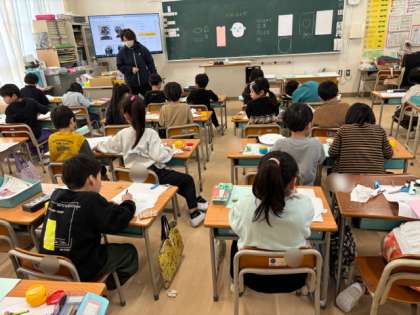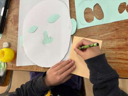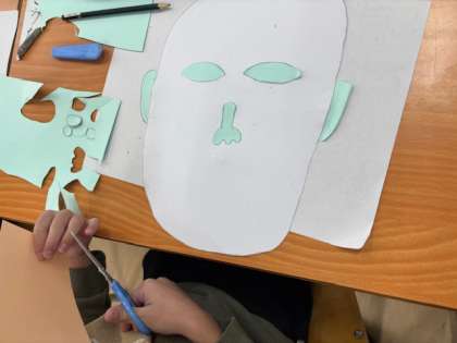 1年生も紙版画に挑戦しています。画用紙を切って顔を作っています。絵に描くのはできるけど、パーツごとに貼り合わせていくのは、なかなか難しいです。目の位置や形をよく見て作っています。どんな版画ができあがるか楽しみです。