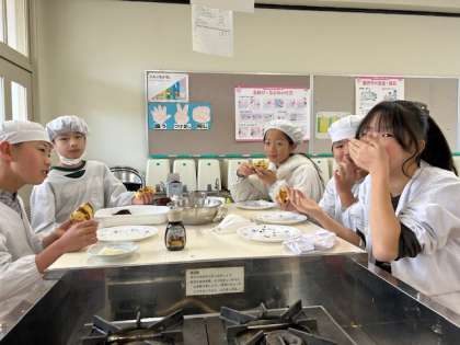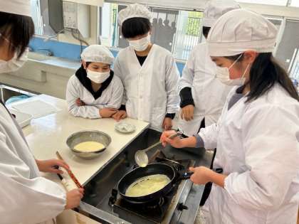 6年生は小学校最後の調理実習です。今日はお楽しみクッキングということで、クレープを作りました。薄い生地なので、うっかり焼き過ぎてしまうこともありましたが、フルーツや生クリームを包みみんなで嬉しそうに食べていました。「家でも作りたーい!」と話していました。