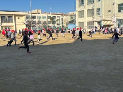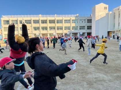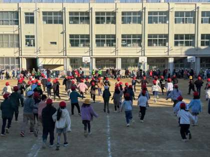 子どもたちは朝から全校でおにごっこをしています。はじめは低学年が追いかける番です。お兄ちゃん、お姉ちゃんを一生けんめい追いかけています。最後は6年生がおにになって追いかけます。子どもは元気です。