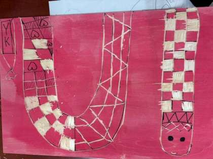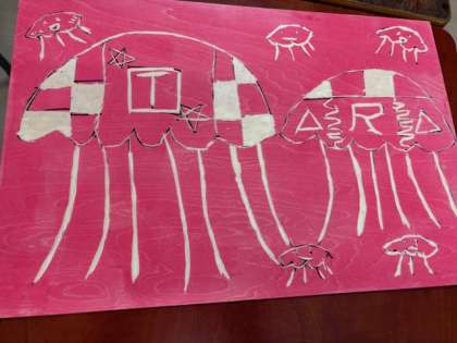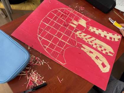 4年生も版画をしています。クラゲや亀、ヘビなどの生き物に色々な柄をデザインして彫っています。どんな作品が完成するでしょうか。怪我のないように慎重に彫り進めていきましょう。