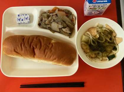 三角形に切って、甘辛く煮た薄揚げ、かまぼこ、白菜、青ネギが入ったうどんに、とろろ昆布を入れて食べます。