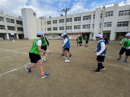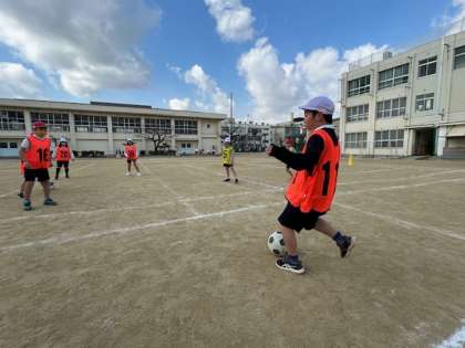 寒さを忘れるくらい運動場で元気いっぱいサッカーをする4年生。今日のゲームのルールは、ドリブル・キーパー無しでゴールをねらいます。ついボールを追い過ぎて、友だちと固まってプレーしていることに気づき、「みんな広がってー!」と声をかけ合いながらゴールを決めていました。