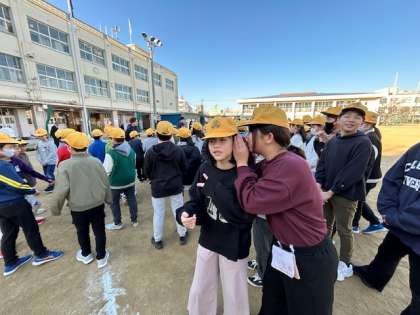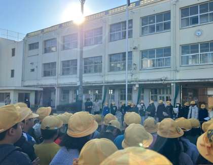 今日は学習朝会の日です。聞いたお題を列の後ろから前へと耳打ちで伝えます。最後のお題は校長先生のフルネームでした。みなさん、お友だちに正しく伝えることができたでしょうか?