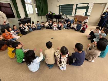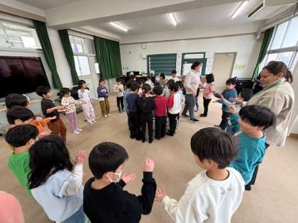 元気な声が音楽室から聞こえて来ます。1年生は楽しそうに歌っています。輪になって友だちと手を繋いだり、お手玉を渡したりしながら歌っています。楽しみながら学ぶことができるといいですね。