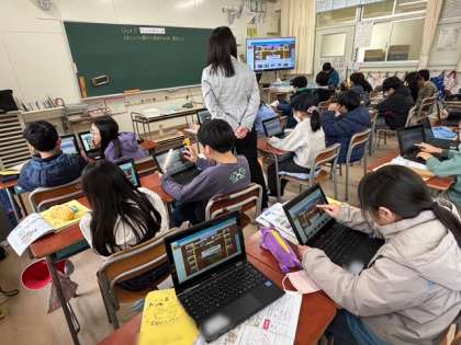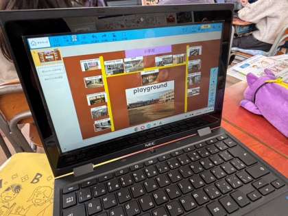 4年生は校内の写真を見ながら、お気に入りの場所を友だちと紹介し合っています。タブレットに貼り付けた写真に沿って、友だちを英語で案内しています。上手く目的の場所まで案内できたでしょうか??