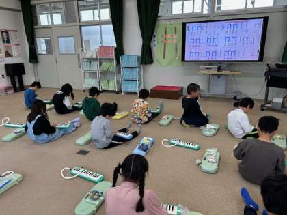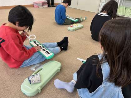 今日は鍵盤ハーモニカのテストです。テスト中はお友だちと「こぎつね こんこん」の曲を弾いたり聴き合ったりしながら練習しています。リズムや指番号にも気をつけながら練習していました。