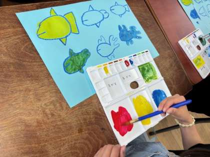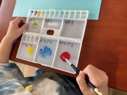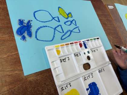 2年生は絵の具の使い方の学習をしています。パレットに絵の具を出して、水をつけて伸ばす練習。伸ばした色同士を混ぜて新しい色を作る練習をしています。筆を使って色をぬるのも難しいです。はみ出ないように丁寧にぬっています。