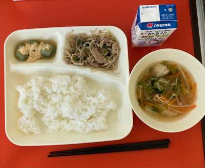 給食のよもぎ団子は、うるち米、もち米、よもぎから作られています。よもぎは、山や野原で自然に生えている春の野草です。やわらかな新芽をすりつぶして、団子に入れています。
