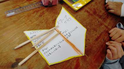 係の表づくりです。今まではあたえられた枠にしっかり書くことを頑張ってきましたが、「相手にわかりやすい、伝わりやすいものにするには、どうすればいいかを考えられる3年生になってほしい。」という先生の思いから、レイアウトや文字の表現をくふうする様子が見られました。
