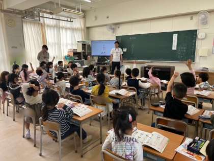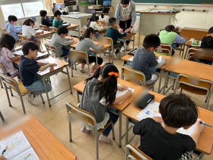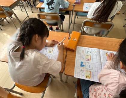 一年生は国語の学習が始まっています。今日はひらがなを書く学習や、ものの名前を読みました。姿勢や鉛筆の持ち方に気をつけてゆっくりと書くことができました。またことばの数に合わせて手打ちでリズムを取りながら楽しんで読む姿が見られました。
