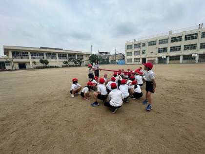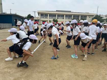 運動会の練習が始まっています。3年生は、今日初めて団体競技の練習しています。棒を持ち、友だちの足元や頭の上を通りスタート地点に戻ってきます。「来た来た!」「しゃがむでー!」とみんな一生懸命でした。これから練習を重ねる毎に慣れてみんなで一致団結していくことでしょう。
