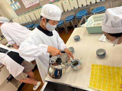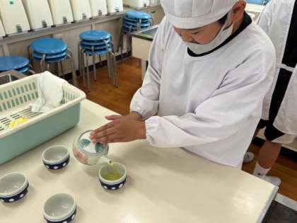5年生は家庭科室でお茶を入れる実習を行いました。やかんでお湯を沸かし、急須にお茶の葉を入れて煮出します。いつも飲むお茶とは少し違い、苦そう。。。と言いながらお茶を入れていました。飲んでみると美味しかったようで、楽しんで実習をしていました。