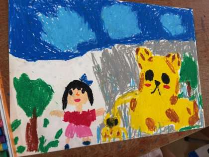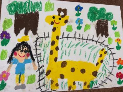 1年生は楽しかった遠足の思い出を絵に描いています。天王寺動物園で見た動物をクレヨンで描いています。どの子も楽しかったことがよく伝わる絵になっています。クレヨンもしっかり塗り込めるようになってきました。