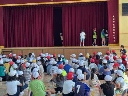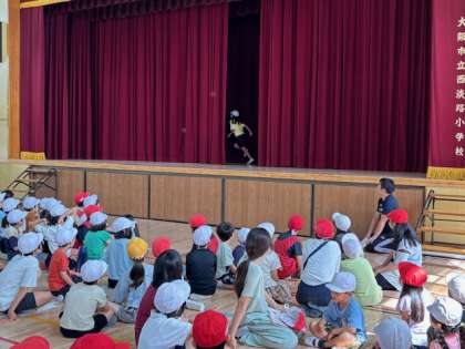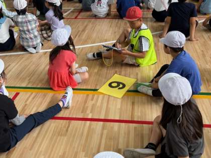 今日はたてわり班でゲーム集会を行いました。幕の間を何人が通ったか数えるゲームです。集会委員会の児童が進行し、集まった子どもたちも楽しそうに参加しています。