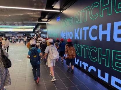 4年生は入場ゲートを通って万博会場に入りました。これから、パビリオンをめざします。みんな元気です。心配なのは天気だけです。