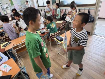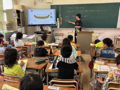 3年生はHow many〜の学習です。りんごがいくつありますか?と英語で伝え、1から20までの数字で答えています。友だちとコミュニケーションをとりながら楽しく学習しています。