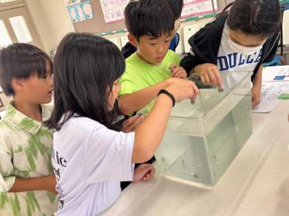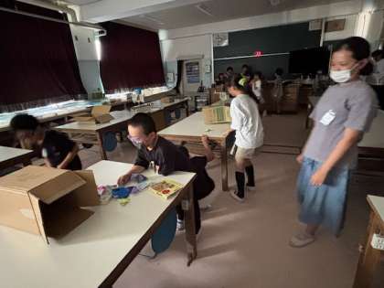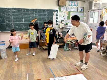 今日は教室でこどもまつりを開催しました。たてわり班でお店を出してゲームをしています。子どもたちはお店を担当する時間と、遊びにいく時間に分かれてお店を回っています。