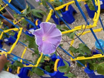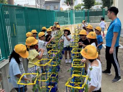 大切に育ててきた朝顔が大きく育ちました。花も綺麗に咲いています。ツルを伸ばすと子どもたちの身長を超えています。夏休み中は家に持ち帰るようです。種子ができるまで家で管理していただくようにお願い致します。