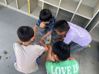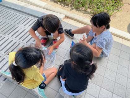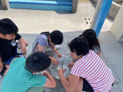 2年生は算数科で水のかさの学習をしています。今日はペットボトルを使って、水の量を比べています。他にも紙パックや空き缶を使って調べています。こぼれないように慎重に測っています。