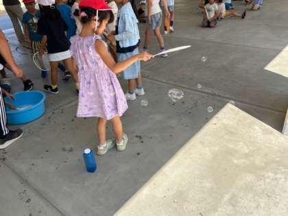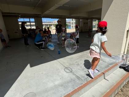 今日はシャボン玉をして楽しみました。モールやうちわをシャボン玉液にひたして、優しく風を送るとシャボン玉ができます。大きなシャボン玉を作る子もいて、とても綺麗です。