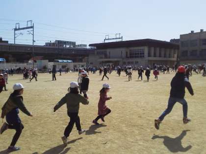 前回は鬼ごっこで、6年生が鬼になってみんなを捕まえましたが、今日は、みんなで6年生を捕まえます。まずは「昆虫太極拳」で準備運動。いよいよ鬼ごっこが始まりましたが・・・、さすがの6年生も、200人もいる1〜5年生からは逃げ切れませんでした。