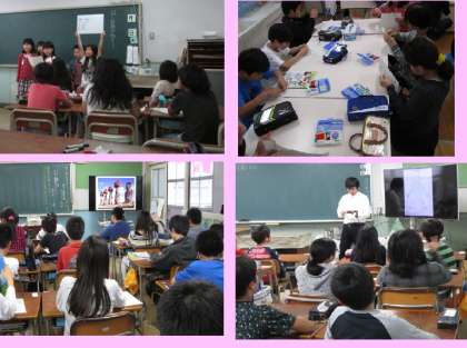 大きなテレビを生かして資料提示をしながらの学習や、調べたことの発表やグループでの話合い活動を取り入れた学習など、各学年・クラスで工夫しながら行う授業を見てもらいました。