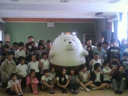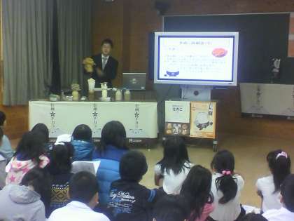 まずはじめに、きのこの種類や栽培方法について教えてもらいました。ゆるキャラ【信州力(しんしゅうりき)】も登場し、子ども達から「かわい〜」と歓声が上がっていました。