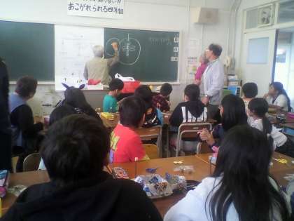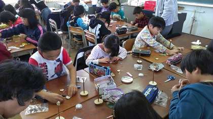 校内の自然観察を終えた後、シニア大学校の方に、自然の木や種、実などを使った工作を教えていただきました。とても細かい作業でしたので、みんな集中して作業を進めていました。