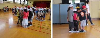 新聞紙がだんだん小さくなって、低学年の子が高学年の子におんぶしてもらっていました。