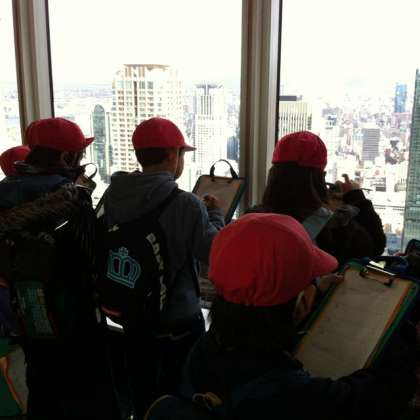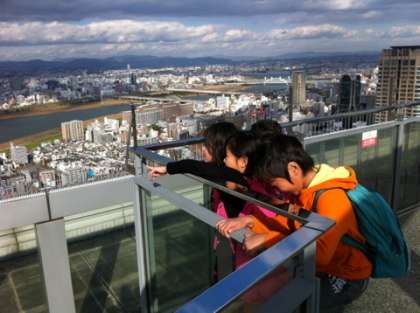 環状線1周のあと、大阪スカイビルに上がり、大阪市内の様子を一望しながら、「向こうの方、ビルが多いで」「あっちは海が見えたけど、こっちからは山が見える」と様々な大阪市を取り巻く景色を観察しました。