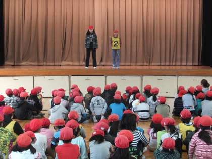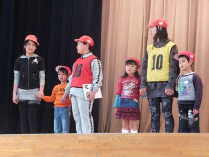 6年生と1年生がペアになって舞台に上がり,1年生を紹介します。