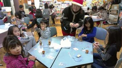 図書館ボランティアのみなさんによる冬の図書館イベント「ツリー作り」が13(金)19(木)の放課後に開催されました!