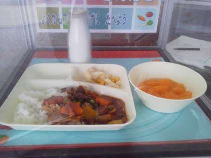 調理員さんがみんなが楽しく食べられるようにと、ハヤシライスにたくさんのラッキーにんじん(桜型・星形・ハート形に型抜きしたにんじん)をたくさん入れてくださいました。