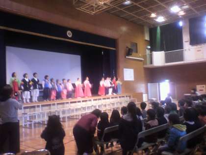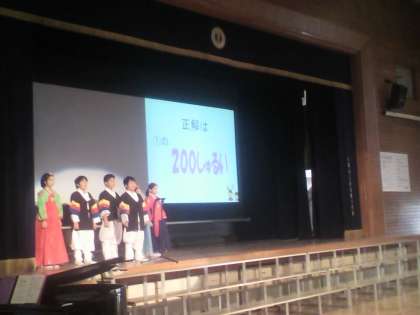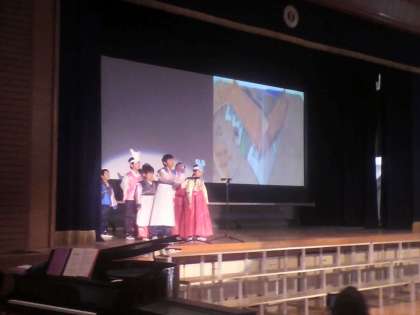 朝鮮人子ども会のメンバーも発表をしました。テーマは『キムチ』でした。低学年の子どもたちが絵本『きょうはソンミのおうちでキムチをつけるひ』を役割読みで朗読し、高学年は『キムチクイズ』、そしてみんなで『キムチのうた』を振りをつけて歌いました。『キムチクイズ』では、「キムチはもともと白かった」ことなどが分かり、会場のみんなは「へぇー」と驚いていました。
