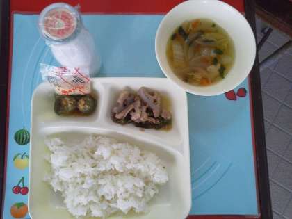 メニューは、豚肉とれんこんの炒め煮、すまし汁、きなこよもぎだんご、ごはん、牛乳でした。