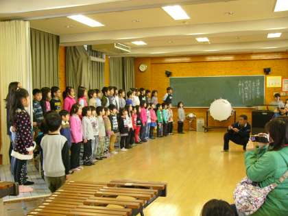 1年生は、今年度最後の参観で、発表会をしました。この1年間の学校生活を振り返り、呼びかけの形で、歌あり、振り付けありと楽しく伝えてくれました。また、『おむすびころりん』をみんなで劇にして発表もしました。