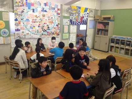 まずは給食を一緒に食べました。いつもは6年生が中心になって、高学年で準備をしていましたが、今日は、6年生をご招待。他の学年で協力して準備をして、一緒に食べました。