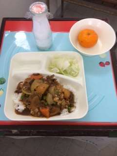 今日のメニューは、ビーフカレーライス、キャベツのピクルス、冷凍みかん です。