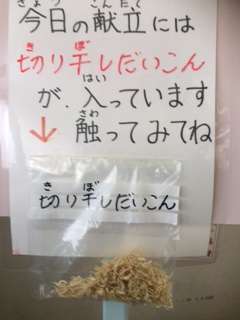 給食室には、水で戻す前の乾いた切干大根がみんなにわかるように展示されていました。