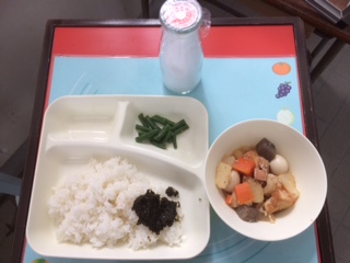 のりのつくだ煮は、給食室で、きざみのりと細かく切ったしいたけを甘辛く煮て手作りしています。市販のものより少し薄味で、のりの香りがしっかりしていて、ご飯に合う一品です。