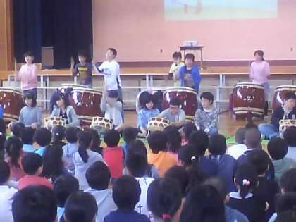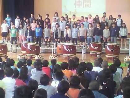 そのあと、6年生がこれまで毎年、なかまのつながりを高め深めるためにしてきたことを通して、がんばる心とあきらめない強さを、呼びかけ・太鼓演奏・歌で伝えてくれました。