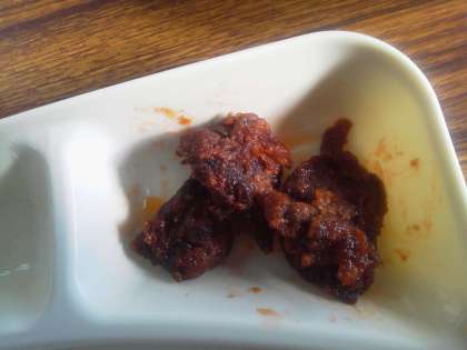 まぐろのオーロラ煮は、年1回使用できるくじらを使った献立です。料理酒、しょうが汁で下味をつけたくじらにでんぷんをまぶして揚げ、ケチャップ、砂糖、赤みそで作ったタレをからませています(下の写真)。くじらは、たんぱく質や鉄分を多く含んでいます。大阪の給食では、子どもの時に食べたという記憶がある人も多いと思います。